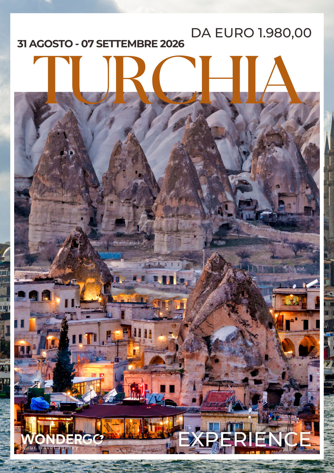 Dove l’Europa sfiora l’Asia, nasce un viaggio che profuma di spezie, storia e meraviglia. Istanbul vi accoglierà con i suoi minareti dorati al tramonto, i bazar profumati e la magia del Bosforo. In Cappadocia, tra i “camini delle fate” e il volo delle mongolfiere all’alba, sembrerà di camminare dentro una fiaba di pietra e silenzio. Un’esperienza che unisce emozione, bellezza e scoperta… per chi ama viaggiare con lo sguardo rivolto all’infinito.