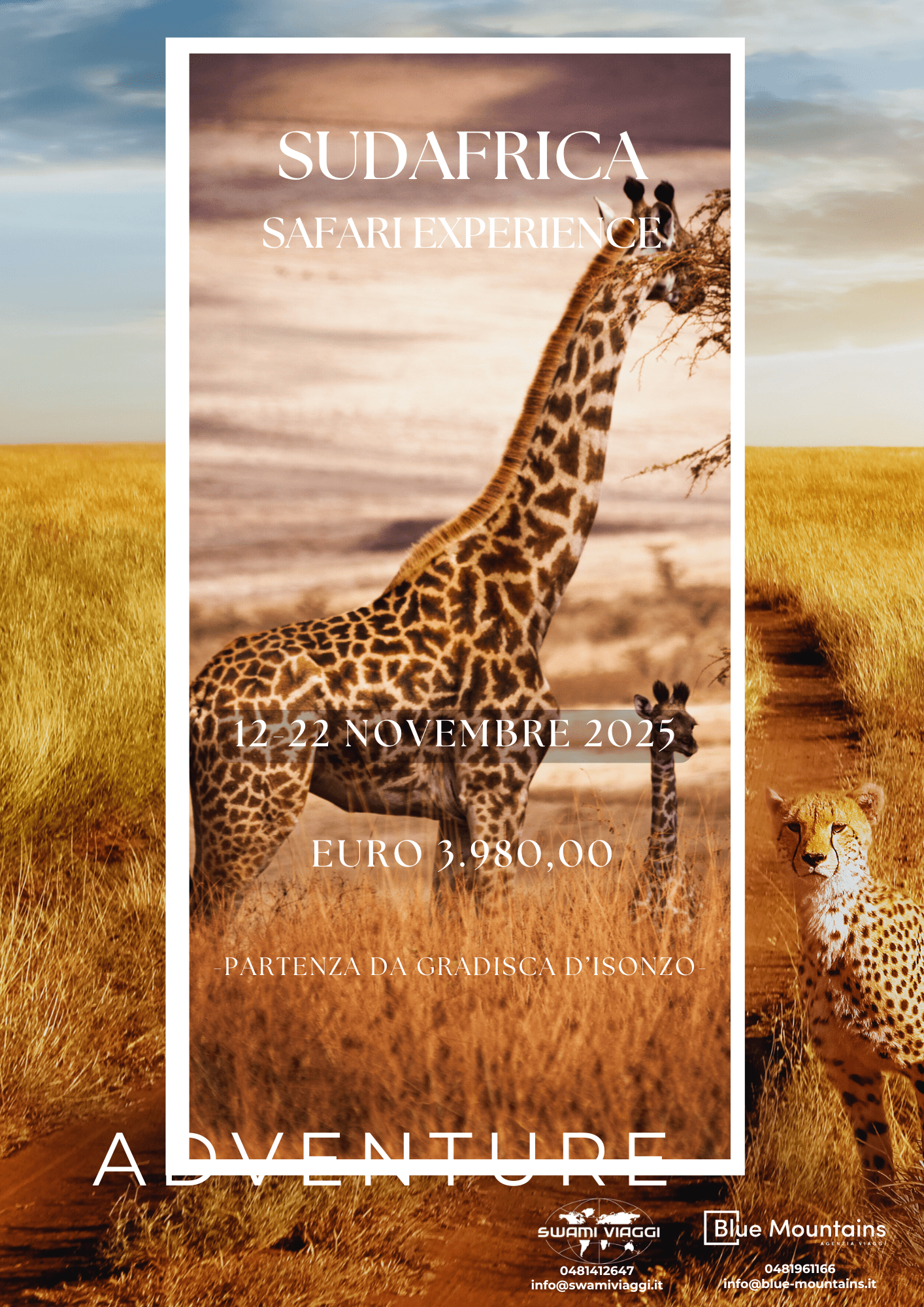 Un viaggio tra Safari naturalistici, storici e culturali, per conoscere il magico equilibrio che regna nella punta dell’Africa. Esplorerete il paese a 360° gradi, conoscendo genialità e stranezze del “primo secondo e terzo mondo” che convivono armoniosamente in Sudafrica. Conoscerete i luoghi e i protagonisti del presente e del passato, il mondo della musica, del cinema, dell’arte e la vita di tutti i giorni del popolo arcobaleno. Un viaggio interattivo divertente ed istruttivo nella profonda e gioiosa anima dell’Africa.
